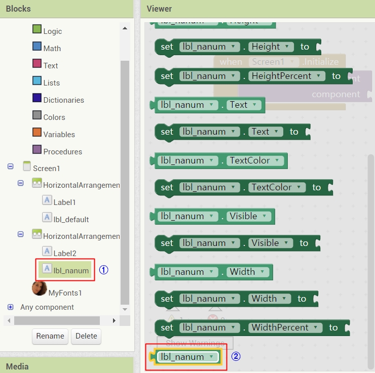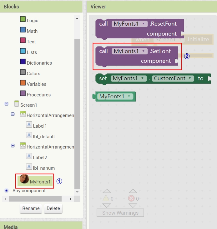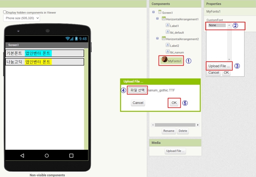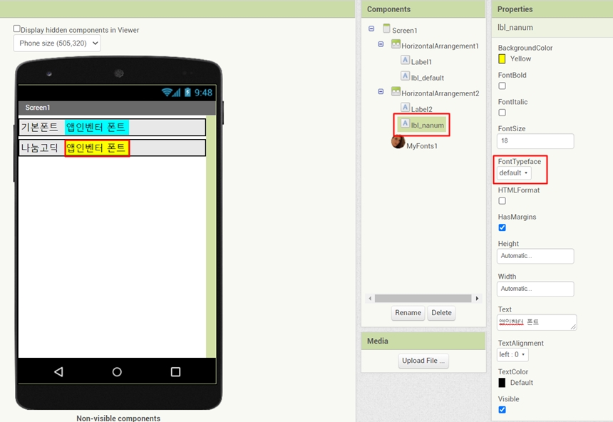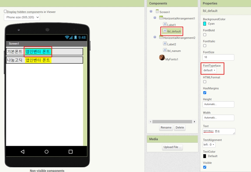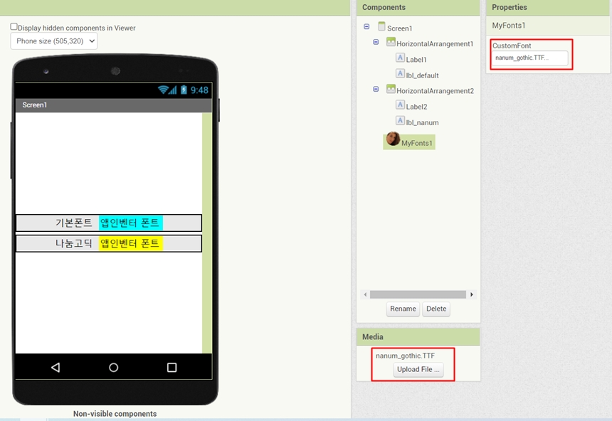 핸드폰 화면 아래쪽 Non-visible components에 MyFonts기능이 추가된 것을 확인할 수 있습니다.