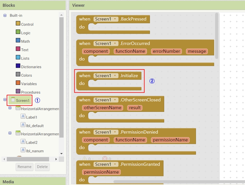 1. 먼저 [Screen1]을 선택하고, [when Screen1.Initialize(Screen1.초기화되었을때)]를 선택합니다.